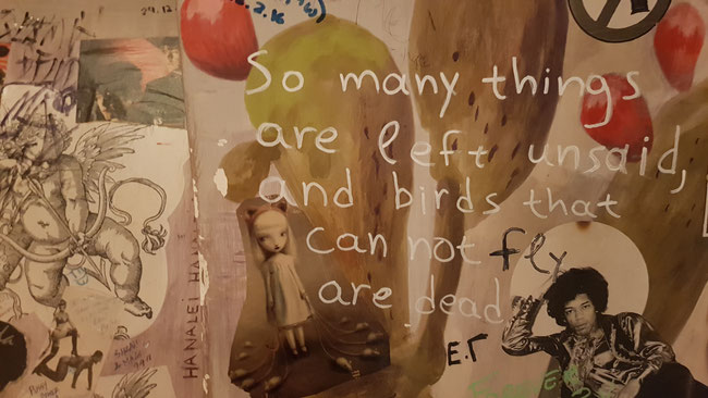 For this whimsical mixed media girl (low budget supplies) I used an old stamped watercolor paper as background. The words on my page say: "So many things are left unsaid and birds that can not fly are dead." I found this sentence on a wall in a restaurant in Rome that's called "Mons Angels".